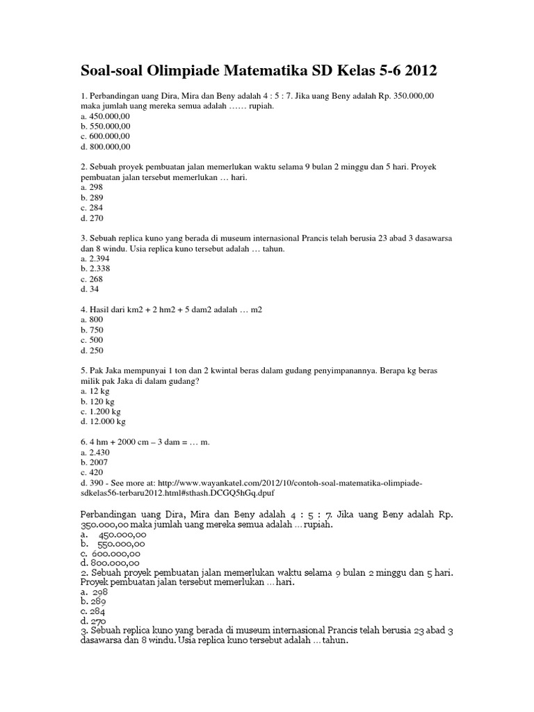 Soal olimpiade matematika sd kelas 4 th 2017. Soal juga dapat diunduh dalam file berformat pdf melalui tautan berikut: Dengan pola pengulangan 3, 9, 7, 1 karena 2011/4 = 502 bersisa 3, maka sebagaimana pada pembahasan soal nomor 5 di atas. Kompetisi sains nasional meliputi 9 bidang keilmuan, yaitu : Pada postingan berikut ini penulis akan melampirkan soal dan pembahasan osn matematika smp tingkat provinsi 2018, dimana pada postingan sebelumnya penulis telah melampirkan soal osn matematika smp. Soal olimpiade matematika statistika dan peluang 1.docx. Karena jumlah angka pertama dan angka terakhirnya adalah 10, maka pasangan angka pertama dan angka terakhir yang mungkin adalah (1,9), (2,8), (3,7), (4,6), dan (5,5) untuk. Pada postingan berikut ini penulis akan melampirkan soal dan. Download soal latihan osn biologi 2020 pdf pembahasan pada kesempatan kali ini website rukimid akan membagikan latihan soal dan pembahasan persiapan osk osp dan osn sma tahun 2020 untuk bidang biologi pdf.