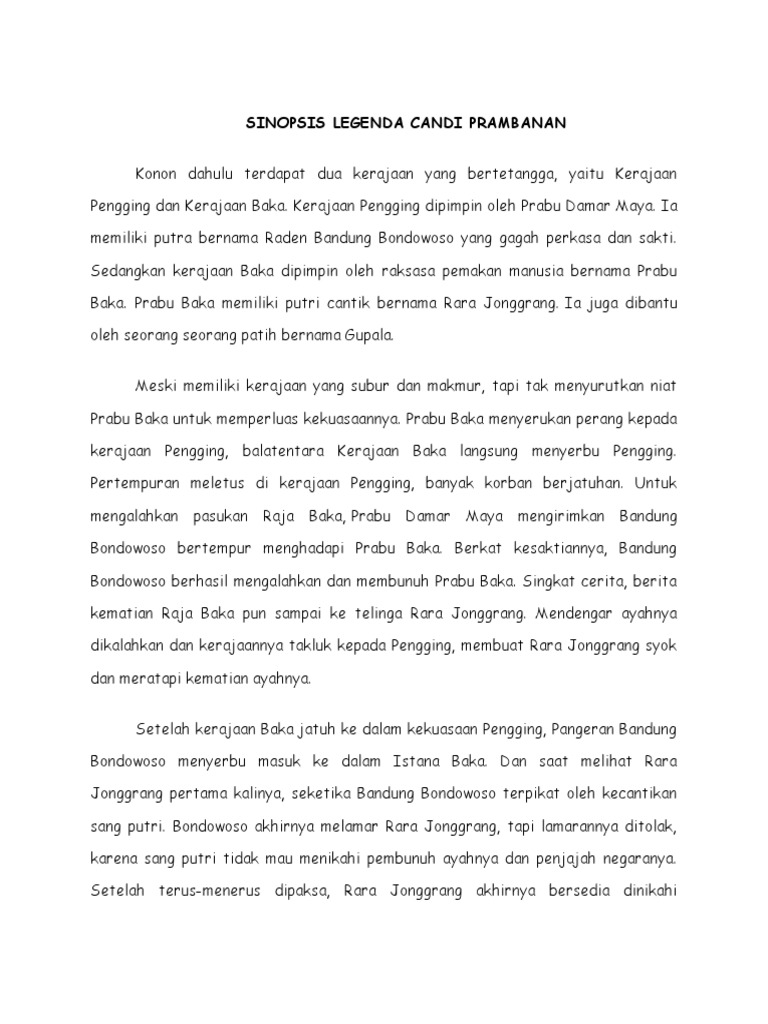 Bagaiman cerita rakyat roro jonggrang dalam bahasa jawa dapat kita simak bersama di bawah ini. Rangkuman cerita rakyat roro jonggrang dalam bahasa jawa. Nah pada artikel kali ini kami akan memberikan salah satu jenis teks dalam bahasa inggris yang telah kami ubah menjadi bentuk drama. Roro jonggrang adalah putri dari prabu baka dari kerajaan prambanan, daerah istimewa yogyakarta, indonesia. But, one day, the kingdom of prambanan was being invaded and colonized by the pengging. Cerita rakyat roro jonggrang dongeng candi prambanan. Pesan moral yang dapat dipetik dari cerita atas adalah akibat yang ditimbulkan dari sifat curang dan licik. Roro jongrang dalam bahasa inggris terupdate roro jongrang. Alkisah, pada dahulu kala terdapat sebuah kerajaan besar yang bernama prambanan.