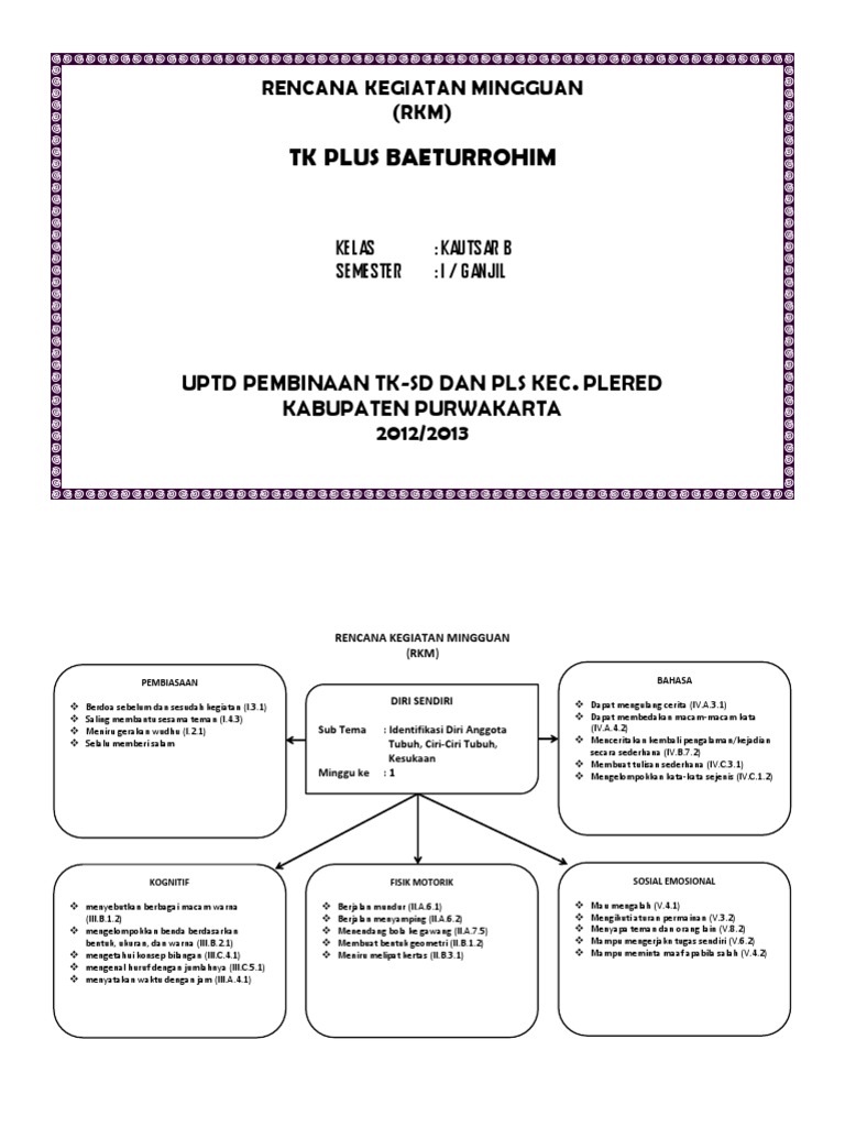 Rkm Paud Semester 1. Kali ini terasfiska.com akan membagikan contoh administrasi pembelajaran untuk paud/tk. Demikianlah postingan download rpph kbpaudtk 1 halamanlembar revisi 2020 semester 1 dan 2. Tema kendaraan minggu 3, 4, 5; Tema rekreasi minggu ke 1, 2; Itulah sekilas gambaran singkat serta contoh rppm/rkm dan pengembangan tema pembelajaran. Diri sendiri 1 disukai 21x diunduh 4106x. Kali ini contoh rppm tk b kurikulum 2013 disajikan selama satu semester. Rkh tk b semester 1 | rkh atau tencana kegiatan harian dalam kurikulum 2013 paud disebut rpph atau rencana pelaksanaan pembelajaran harian. Tema binatang untuk minggu ke 11, 12, 13; Tema lingkunganku untuk minggu ke 4, 5, 6; Rppm k13 paud semester 1 dan semester 2 lengkap semua tema ini merupakan file terbaru yang akan saya bagikan dalam kesempatan kali ini. Dan tidak lupa perangkat pembelajaran ini kami bagikan secara gratis tentunya. Dalam format doc word yang dapat di edit dengan mudah menyesuaikan dengan visi misi lembaga paud. Sudah menjadi kewajiban guru/ pendidik untuk membuat perangkat pembelajaran sebelum melaksanakan proses belajar mengajar. Menyusun rkm (renana kegiatan harian) atau yang sekarang disebut dengan rppm (rencana pelaksanaan pembelajaran mingguan) dalam kurikulum 2013.penyusunan rkm/ rppm tk a semester 1 ini mengacu pada program.